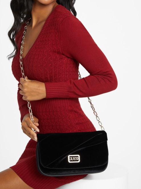 Para Escapadas De Día A Excursiones Nocturnas, Este Bolso De Mano Es Un Compañero Elegante. Diseñado Con Una Fabricación Drapeada Aterciopelada, Placa Con El Logo, Correa De Cadena De Metal Desmontable Y Cierre Plegable. Estilo: 14353565
