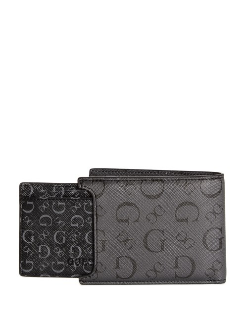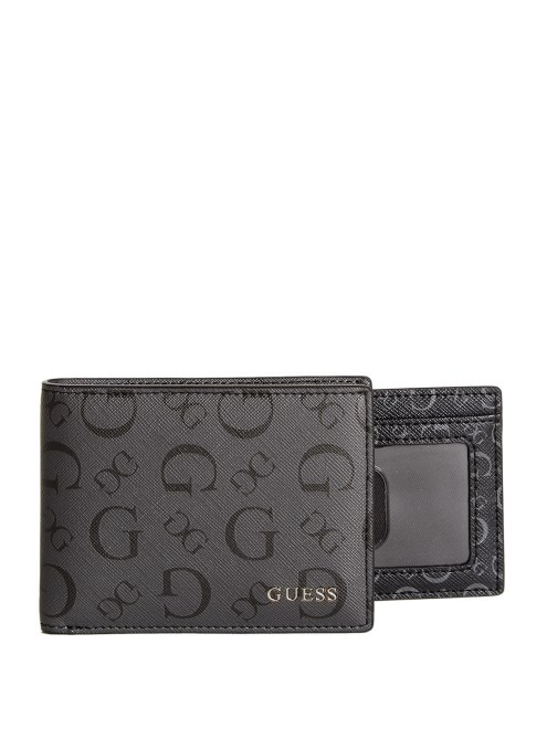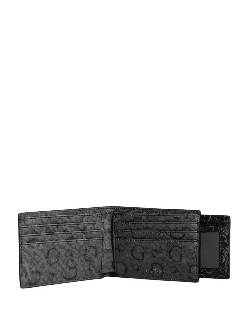 Una Cartera Plegable Clásica Con Un Toque. Este Accesorio De Piel Sintética Tiene Un Logotipo Impreso Por Toda La Prenda Y Una Ventana De Identificación Extraíble Para Un Almacenamiento Compacto.