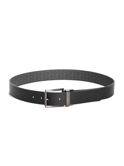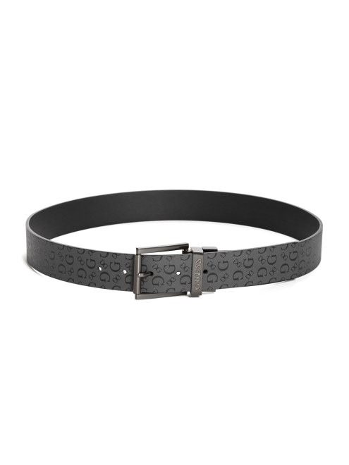 un Cinturón De Piel Sintética Con Un Logotipo Estampado Por Toda La Prenda, Diseño Reversible Y Hebilla Plateada.