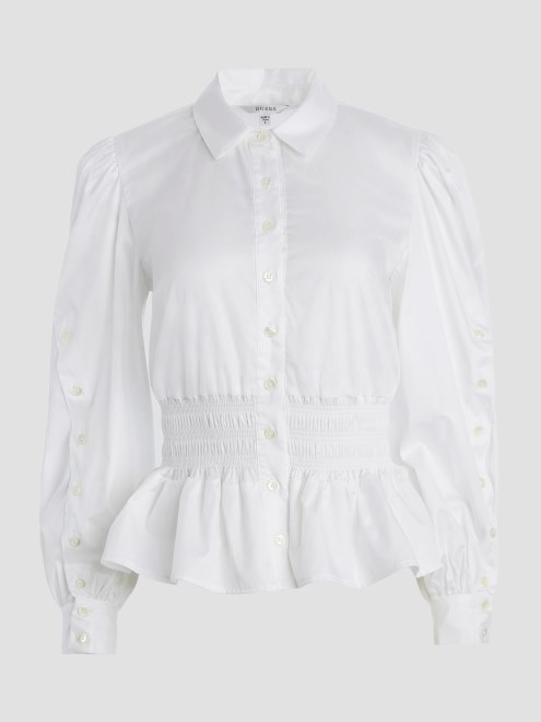 Elegancia Femenina En Una Sola Pieza, Esta Bonita Blusa Tiene Un Cuello En Punta, Mangas Largas Abullonadas Con Hombros Fruncidos Y Una Cintura Fruncida Con Dobladillo Con Peplum Plisado.