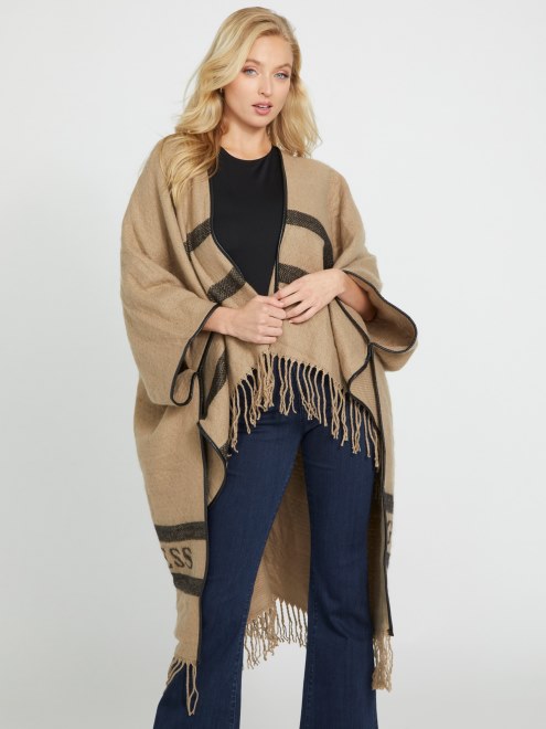 Completa Tu Estilo Con Esta Ruana De Punto Cálido Que Presenta Un Diseño Sólido Con Detalles A Rayas Y Texto Del Logotipo Cerca De Los Extremos Con Borlas. Estilo: 14383980