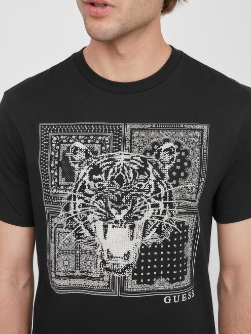 Ve Ferozmente Con Esta Camiseta De Punto Que Presenta Un Tigre Adornado Con Diamantes De Imitación Y Un Estampado De Bufanda Cuadrada, Cuello Redondo Y Mangas Cortas. Utiliza Fibras De Algodón Orgánico.