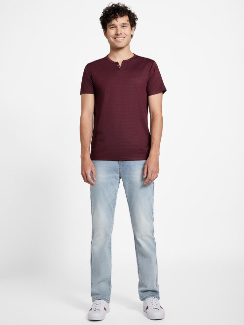 Una Camiseta De Punto Jacquard Pulido Con Escote Dividido Y Mangas Cortas.