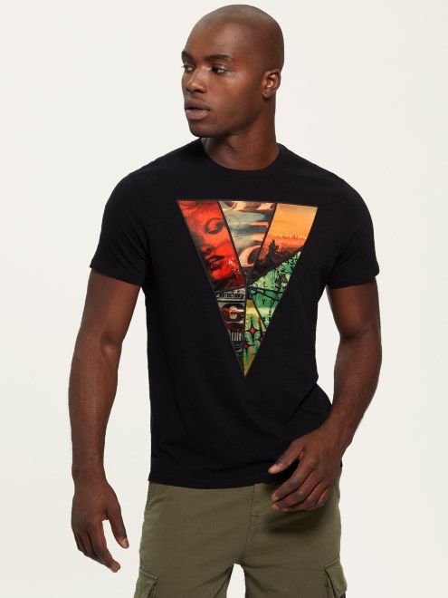 Camiseta De Manga Corta Con Cuello Redondo Que Presenta Un Diseño Gráfico De Triángulo De Gran Tamaño Con Múltiples Cortes De Diferentes Imágenes.