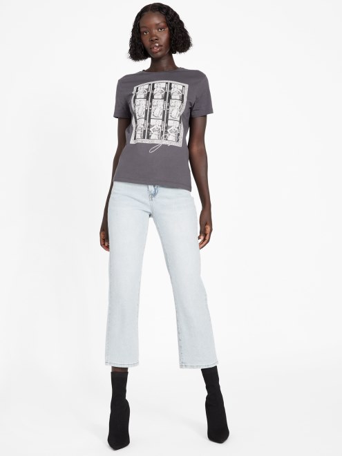 Adopte Su Propia Pose Con Esta Camiseta De Punto Con Imágenes De Carretes De Película Con Un Fondo De Leopardo Y Un Logotipo De Pedrería, Así Como Un Cuello Redondo Y Mangas Cortas.