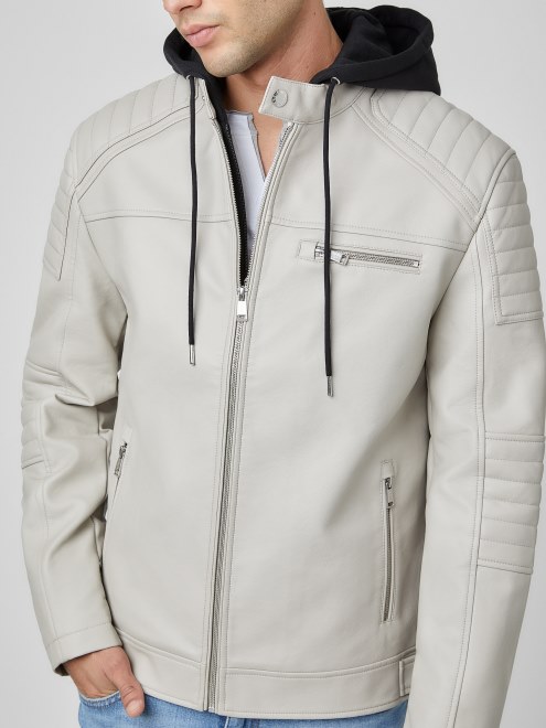 Completa Tu Look Con Esta Cazadora De Motociclista De Piel Sintética Con Acolchado Acolchado A Lo Largo De Las Mangas Largas Y Una Inserción De Algodón Jersey Con Capucha Extraíble. Bolsillo Con Cremallera En El Pecho Y Cierre Frontal Con Cremallera.