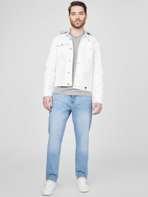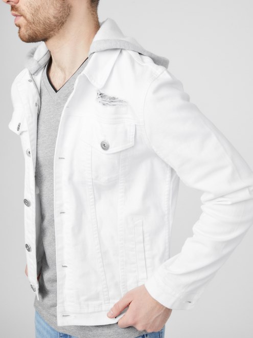 Agrega Un Acabado Clásico A Tu Look Con Esta Chaqueta De Mezclilla, Que Cuenta Con Una Capucha Tejida Removible, Cierres Con Botones Al Frente Y Bolsillos Al Frente Inclinados. Detalles Desgastados, Bolsillos Delanteros De Parche Y Cuello En Punta.