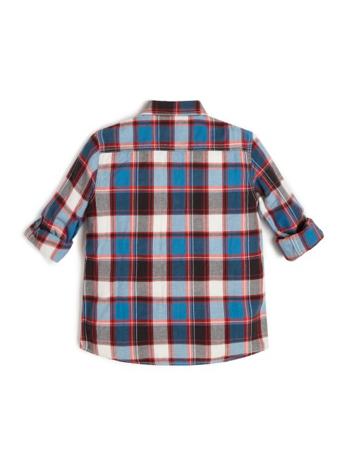 Estilizado A Su Gusto. Esta Camisa De Sarga Tiene Mangas Ajustables Con Lengüeta Enrollable, Un Patrón De Cuadros Escoceses En Toda La Prenda, Botones A Presión En La Parte Delantera, Canesú Occidental, Bolsillos Con Solapa En El Pecho Y Un Gran Parche Con El Logo En La Parte Delantera.