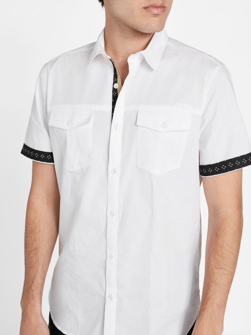 Minimalista Y Atemporal, Esta Camisa Esencial Es Imprescindible En Tu Guardarropa. Con Cuello, Estampado Geométrico En El Bajo, Dos Bolsillos En El Pecho Y Manga Corta. Hecho Con Fibra De Algodón.