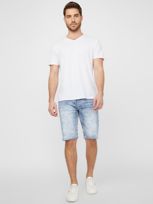 Un Par De Shorts De Mezclilla Hasta La Rodilla Con Detalles Desteñidos Y Destruidos Por La Luz Para Una Apariencia Relajada. Terminado Con Dobladillos Deshilachados.