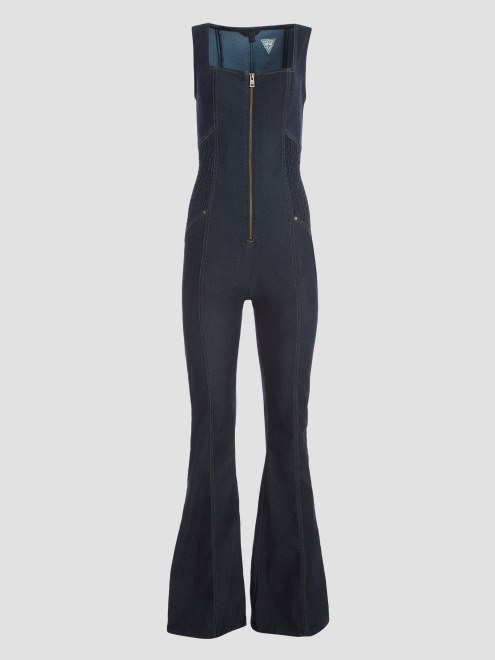 Pasea Por Los Desiertos Altos O Sé Un Habitante Urbano Con Este Impresionante Mono De Mezclilla. Diseñado Con Una Silueta Que Se Ajusta A La Figura, Escote Cuadrado, Patrón De Contorno Geométrico, Pierna Acampanada Y Cierre Frontal Con Cremallera.