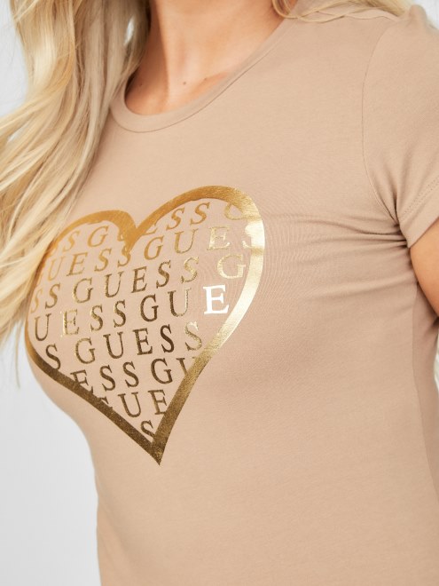 Déjate Seducir Por Esta Camiseta De Cuello Redondo Que Presenta Un Corazón Metalizado Con Detalle De Texto De Logotipo Repetido En La Parte Delantera.