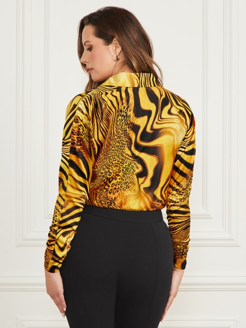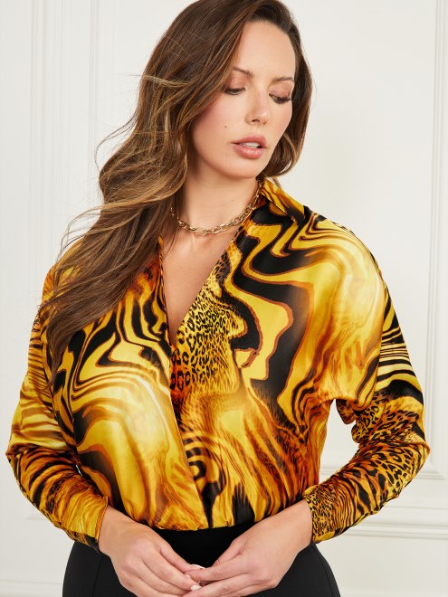 Diseñado En Una Irresistible Fabricación Sedosa Y Un Estampado Ferozmente Atractivo, Este Body De Manga Larga Presenta Un Cuello Doblado Y Un Escote En V De Sobrepelliz Con Cierre Frontal. Parte Inferior De Tanga Con Cierre De Botones A Presión.