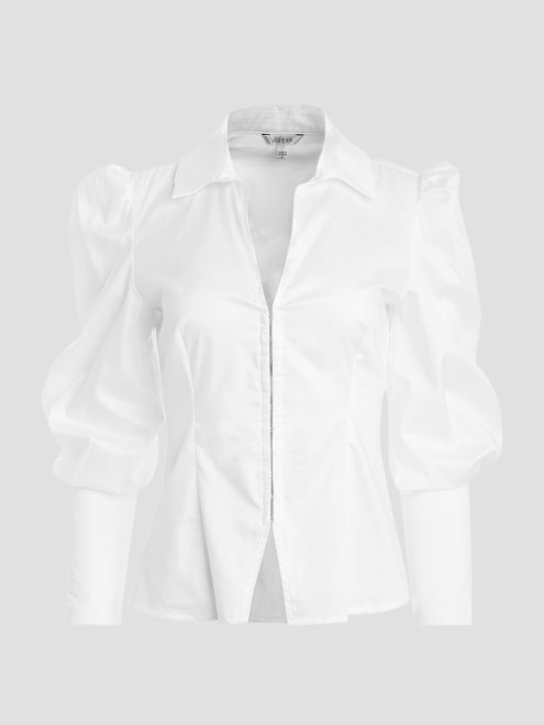 Sofisticada Y Elegante, Esta Moderna Camisa De Satén Presenta Mangas Globo Largas Con Puños Ventilados, Escote En V Con Cuello Doblado Y Espalda Ceñida Con Cordones.