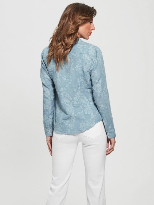 Mantén Tu Estilo Desenfadado Con Esta Camiseta De Manga Larga Con Cuello Doblado, Dos Bolsillos En El Pecho Y Un Intrincado Diseño Floral Tejido En Jacquard. Cierres De Botones Delanteros.