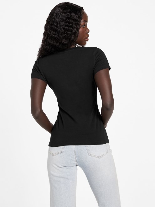 Enamórate De Esta Camiseta De Manga Corta Que Presenta Un Escote En V Con Gráficos De Labios Y Texto En El Frente Acentuado Por Detalles De Cristal De Roca Y Pedrería. Utiliza Fibra De Algodón Orgánico.