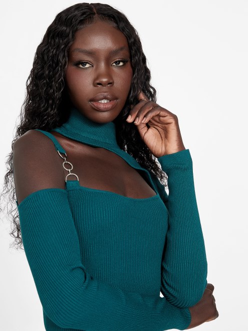 Muestra Tu Figura En Este Top Recortado. Con Tejido Acanalado Por Toda La Prenda, Diseño De Corte Asimétrico, Detalle De Cadena En Tono Plateado, Cuello Alto Y Mangas Largas.