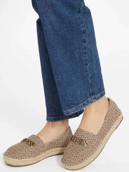 Un Par De Lindos Y Casuales Zapatos Sin Cordones Con Un Emblema Del Logo, Punta Redonda Y Suela Tipo Alpargata. Opciones De Piel Sintética Y Logotipo Impreso.