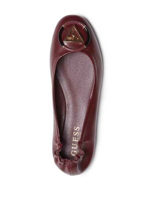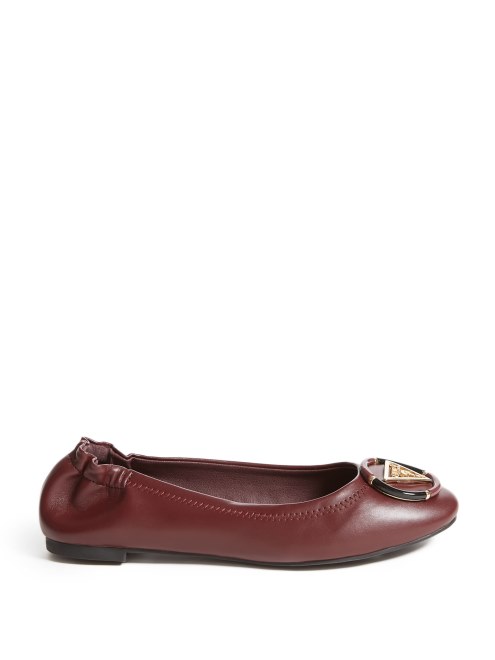 Ideales Para El Trabajo O El Fin De Semana, Estas Bailarinas De Piel Sintética Cuentan Con Un Emblema Del Logo Triangular Dorado Rodeado Por Un Detalle Circular, Espalda Fruncida Y Tacón Ligero.