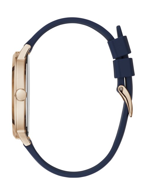 Manténgase Elegante Con Este Reloj Analógico En Tono Dorado Rosado, Que Cuenta Con Una Correa De Silicona Azul Marino, Detalle De Logotipo Y Caja En Tono Dorado Rosado A Juego.