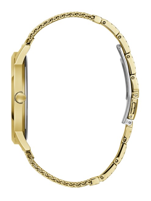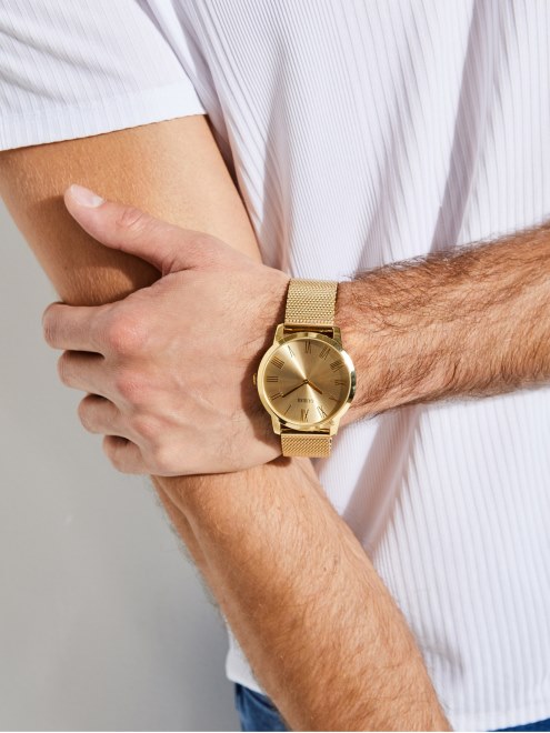 Agregue Un Toque Moderno A Su Estilo Con Este Reloj Analógico En Tono Dorado, Que Cuenta Con Un Brazalete De Malla, Un Detalle Del Logotipo Y Una Caja A Juego.