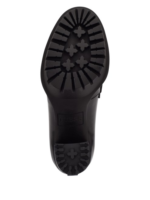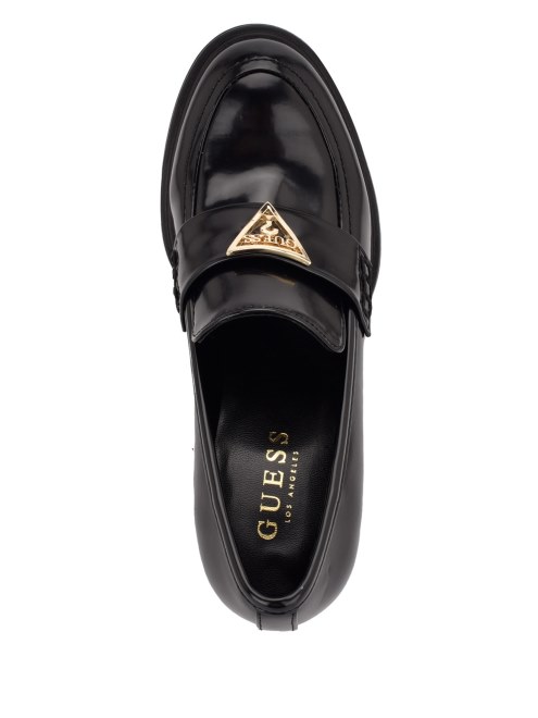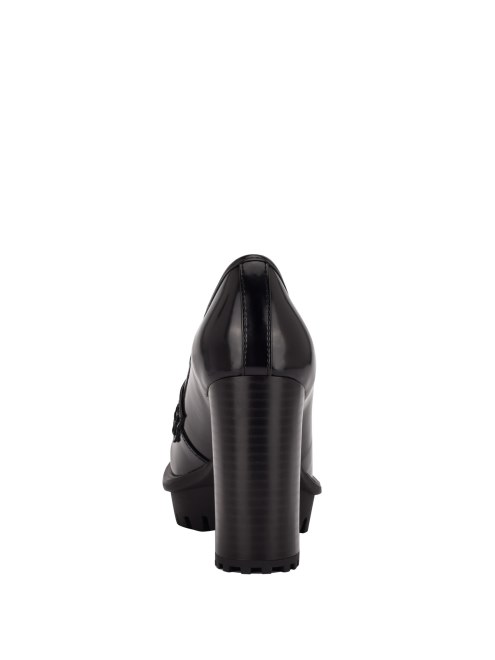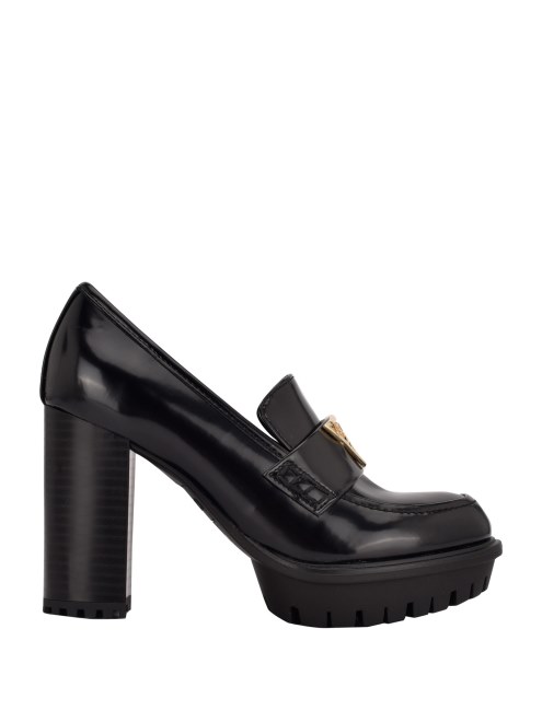 Un Par Elegante Con Un Estilo De Inspiración Vintage. Mocasines De Piel Sintética Con Puntera De Almendra, Tacón En Bloque, Suela Gruesa Y Emblema Del Logo Triangular.