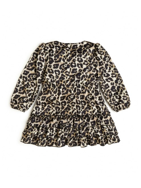 El Divertido Estampado De Leopardo Realza Este Elegante Vestido De Satén Que Le Encantará, Diseñado Con Mangas Largas, Volantes En El Dobladillo Y Cierre De Cremallera En La Parte Posterior. Contiene Plástico Reciclado.