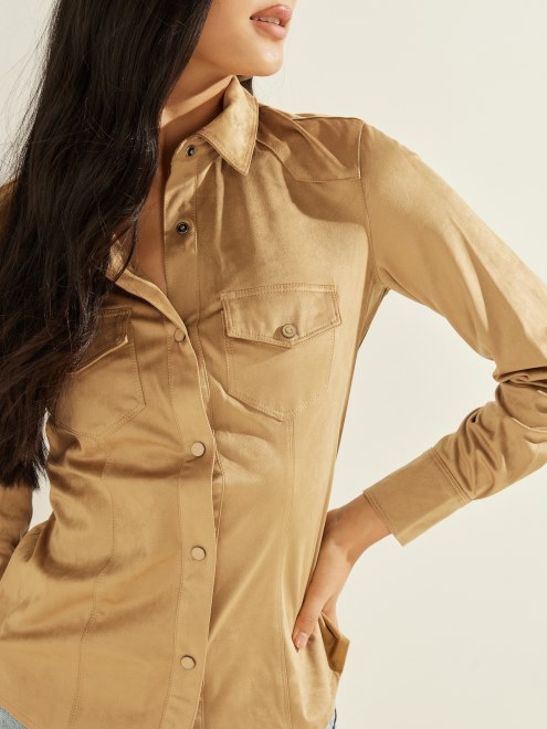 Confeccionado En Una Lujosa Tela De Gamuza Sintética, Este Top De Manga Larga Inspirado En El Oeste Presenta Un Cierre Frontal A Presión, Bolsillos Frontales Y Cuello Doblado.