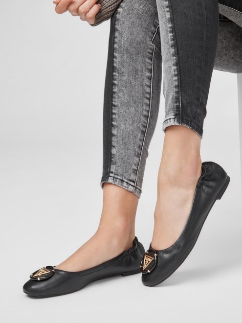 Ideales Para El Trabajo O El Fin De Semana, Estas Bailarinas De Piel Sintética Cuentan Con Un Emblema Del Logo Triangular Dorado Rodeado Por Un Detalle Circular, Espalda Fruncida Y Tacón Ligero.